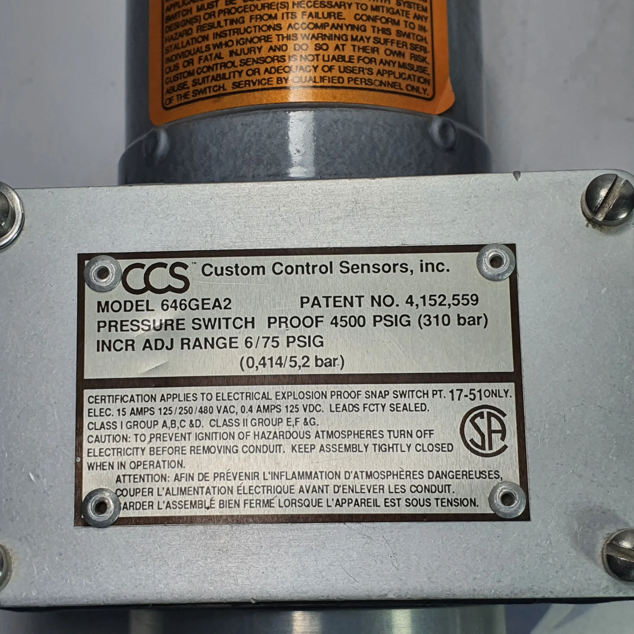 CCS INC. 646GEA2 PRESSURE SWITCH, PATENT NO. 4,152,559